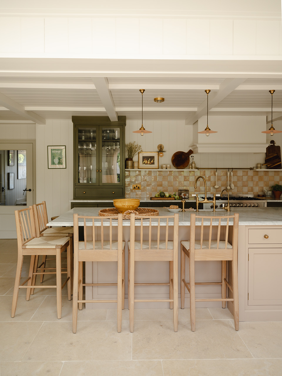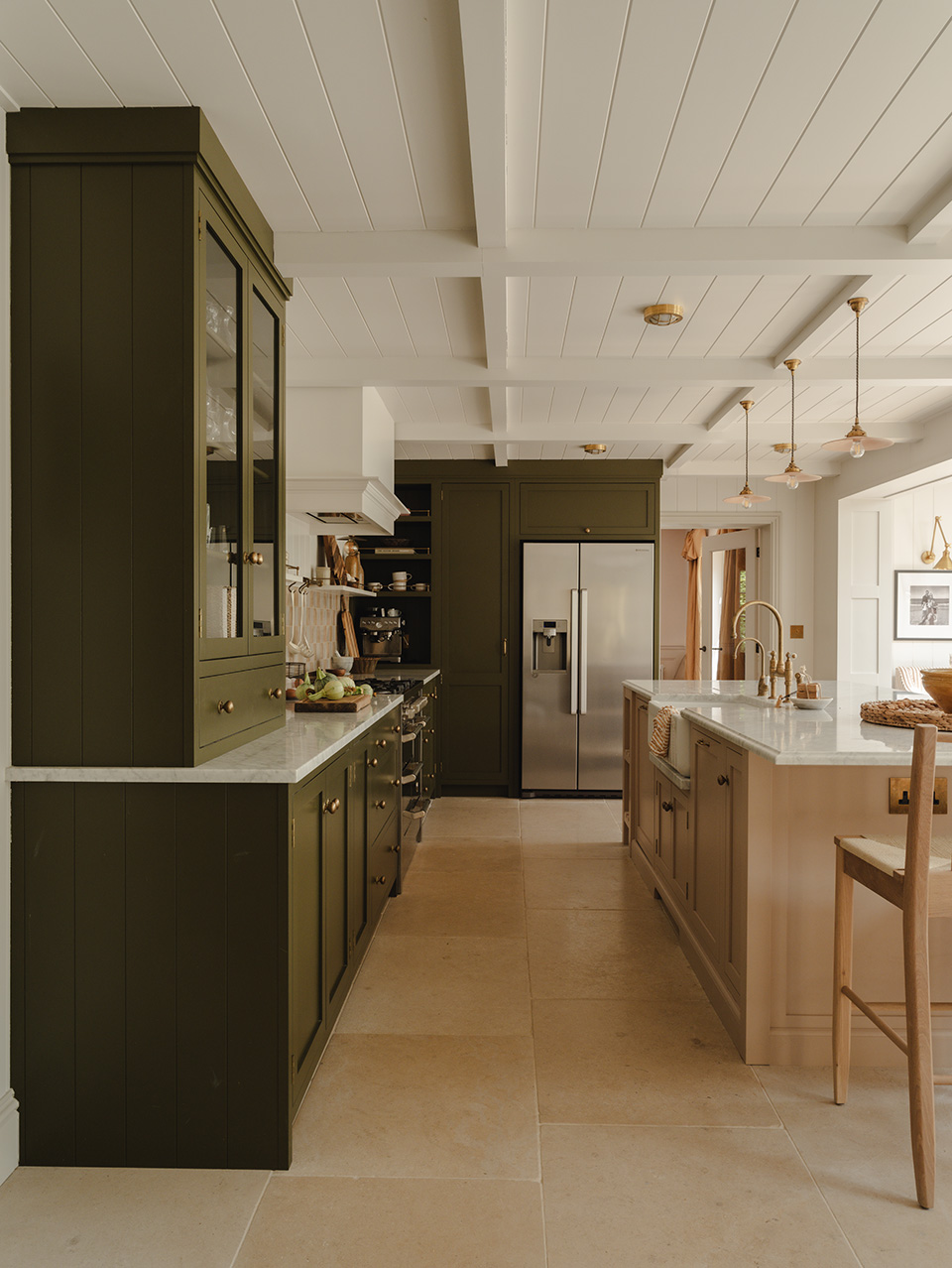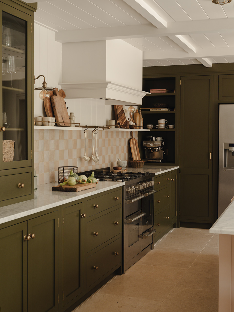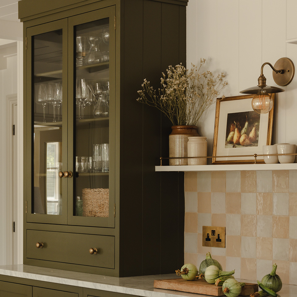 Bringing kitchens to life, designed as a natural extension of, rather than separate from, the rest of the home. Our characterful project in collaboration with House Nine Design exemplifies the evolution of this hardworking room into a stylish, versatile space for everyday living and entertaining. With a coffered ceiling adding an extra layer of decorative detail, the overall layout is open and airy thanks to a primarily low-level cabinet run. Cupboards and deep drawers with pullout components provide ample storage here and discretely located on the island, freeing up the wall for display shelves and splashy tiles. Our hand-painted Shaker cabinetry brings enduring classic style as well as a cool quirky touch in its contrasting colour palette.